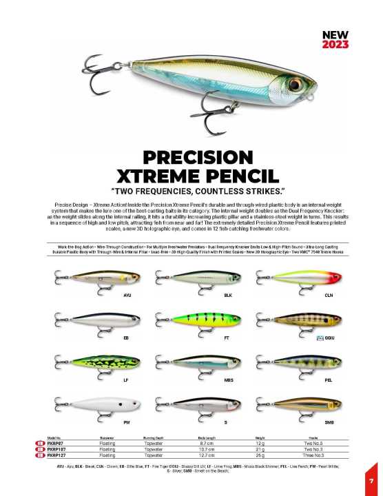 Precizan dizajn – ekstremna akcija! Unutar izdržljivog plastičnog tijela Precision Xtreme Pencil-a nalazi se unutarnji sustav utega koji varalicu čini jednim od varalica sa najboljim bacačkim karakteristikama u svojoj kategoriji. Krasi ih ugrađena dvofrekventna kuglica u tijelu varalice za pružanje jedinstvene podvodne akustike. To rezultira slijedom visokog i niskog tona, privlačeći ribu izbliza i izdaleka! Iznimno detaljni dekori Precision Xtreme varalica sa 3D holografskim okom dodatno će privuči grabežljivce!