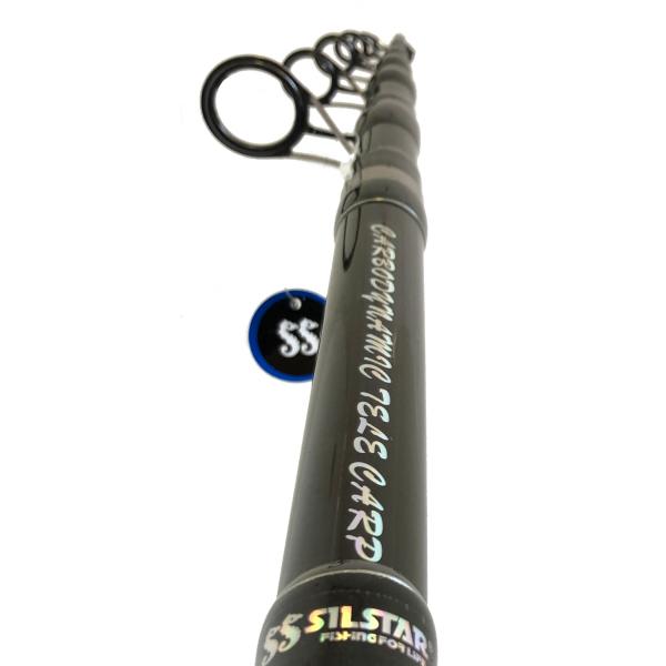 SILSTAR CARBODYNAMIC TELE CARP 3LB 3,6 m. Normalni teleskopski štapovi za šaranski ribolov su prilično debeli, teški i obično im akcija nije najbolja. Zato je SILSTAR koristio IM8 karbonski materijal umjesto tradicionalnog kompozita ili stakloplastike za izradu tijela štapa. Ovaj karbonski materijal je izuzetno lagan i čvrst. Štap je opremljen SIC vodilicama smještenim u jakim dvokrakim vezanim okvirima, koji su također prikladni za ribolov s pletenim predvezom ili pletenom strunom. Ležište role izrađeno je od čvrstog, otpornog na udarce ABS-grafitnog materijala, ručka je opremljena protukliznim premazom. Štap je posebno razvijen za zabacivanje na velike udaljenosti.
